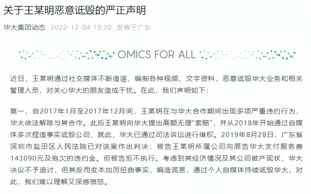 对于王明德举报,华大基因却另有说辞,12月4日,华大基因通过官方微信公众号发布《关于王某明恶意诋毁的严正声明》称,王德明身体致残是因为他在第十五届国际基因组学大会(ICG-15)在武汉举办期间,未经邀请就进入会场寻衅滋事,被保安打断了七根肋骨。