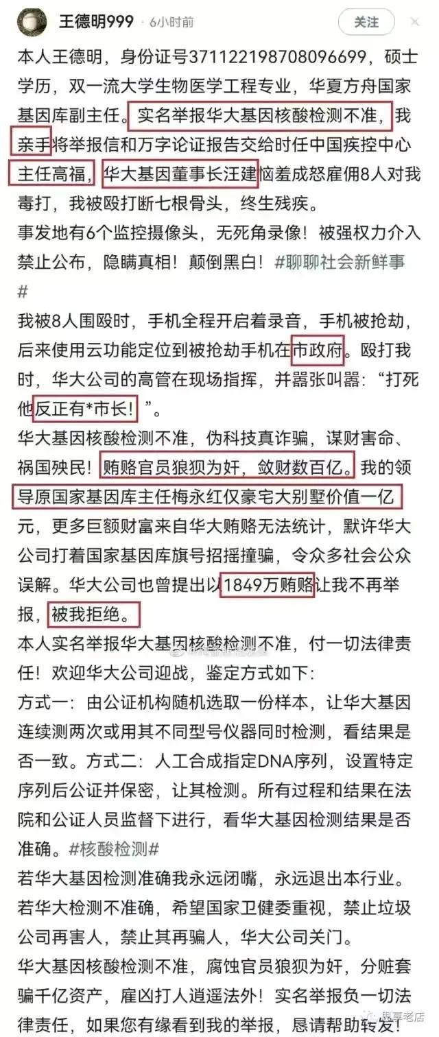 近日,华夏方舟基因副主任王德明实名举报华大基因核酸检测造假,但是却被华大基因董事长雇人对他进行殴打!最终王德明受了重伤,肋骨断掉7根,造成终身残疾,的事情上了热搜。