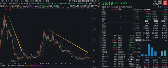 与此同时,华大基因股价自2020年7月14日阶段性高点至今跌幅也已超七成,对应市值蒸发超500亿元。目前公司股价为55.19元/股,市值228亿元。不仅已经完全抹平疫情期间的涨幅,而且正向公司历史股价最低点俯冲而去。