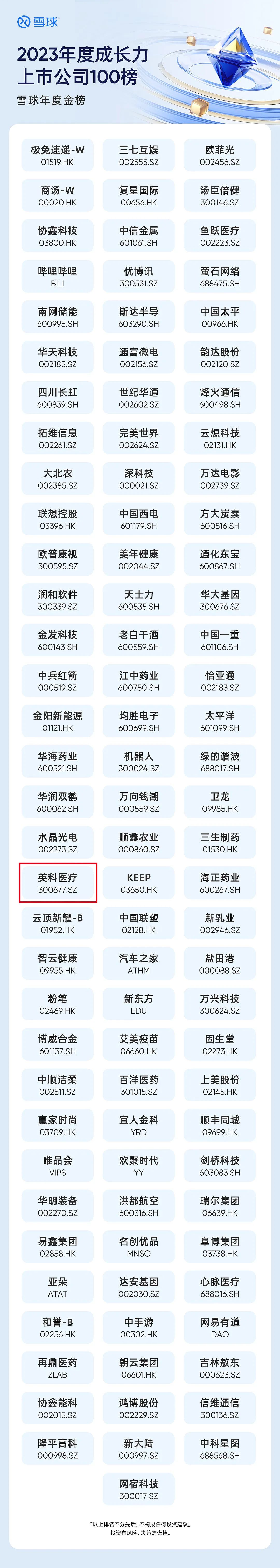 近日,英科医疗在国内知名投资者社区雪球的评选中,荣登2023年度成长力上市公司100榜。这一奖项是根据雪球指数、财务表现、二级市场交易活跃度等综合因素评选而出,旨在表彰在各个维度上表现优秀的上市公司。