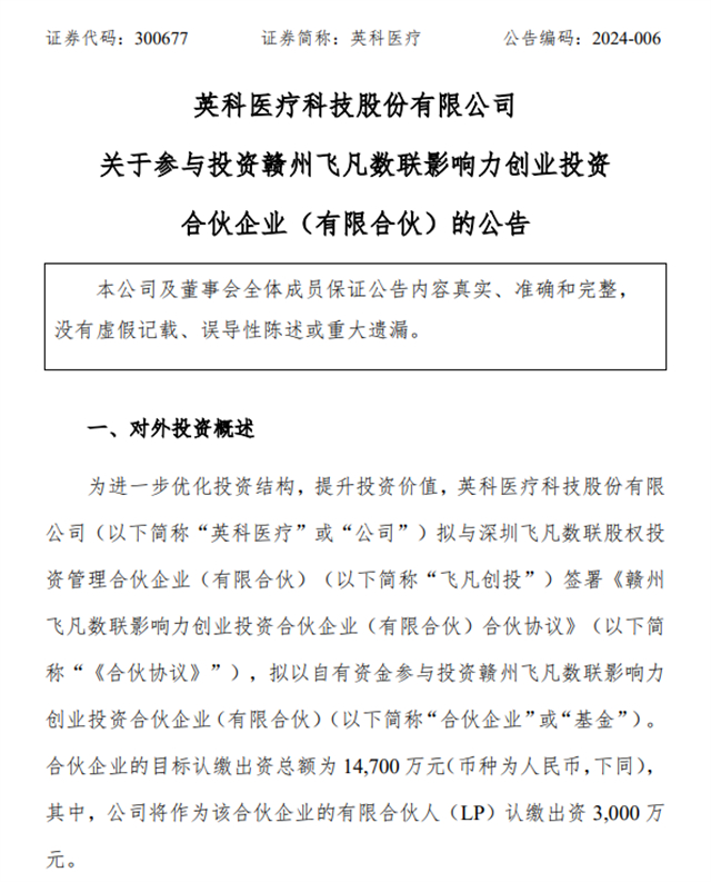 如何利用这笔资金,让公司业绩再上新台阶,英科医疗似乎已作出选择。2024年1月19日,英科医疗发布公告称,为进一步优化投资结构,提升投资价值,英科医疗拟与深圳飞凡数联股权投资管理合伙企业(有限合伙)(以下简称“飞凡创投”)签署《赣州飞凡数联影响力创业投资合伙企业(有限合伙)合伙协议》(以下简称“《合伙协议》”),拟以自有资金参与投资赣州飞凡数联影响力创业投资合伙企业(有限合伙)(以下简称“合伙企业”)。合伙企业的目标认缴出资总额为 14,700 万元,其中,英科医疗将作为该合伙企业的有限合伙人(LP)认缴出资 3,000 万元。