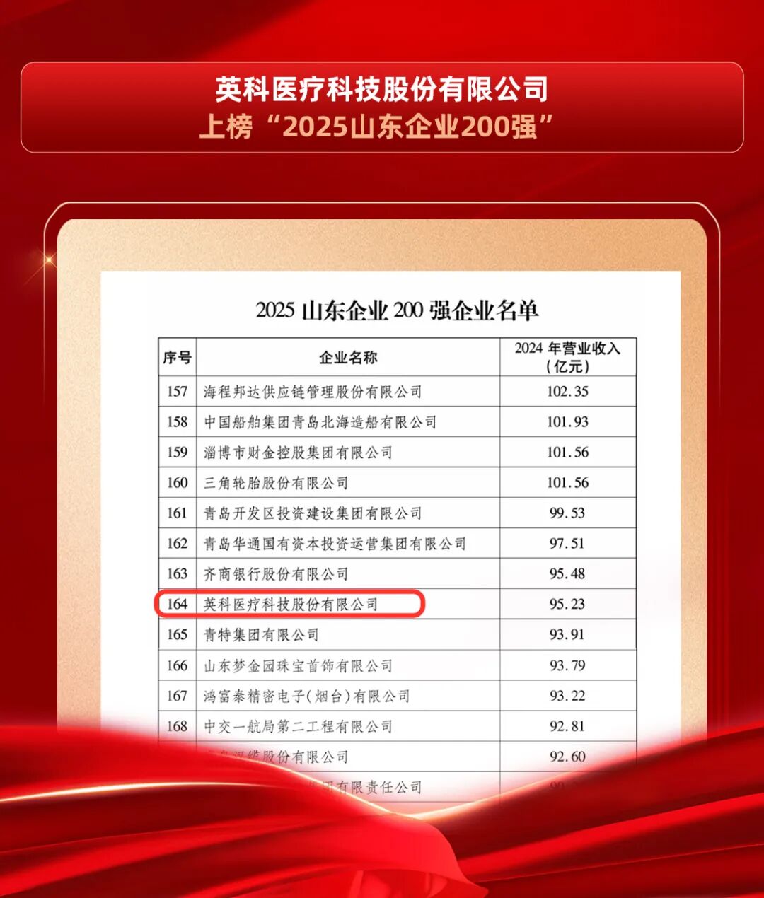 近日,2025山东企业200强榜单正式发布,英科医疗凭借扎实的经营基础、持续提升的综合实力以及在区域经济中的突出贡献成功上榜,再次展现了公司在山东省乃至全国医疗健康产业中的重要地位。