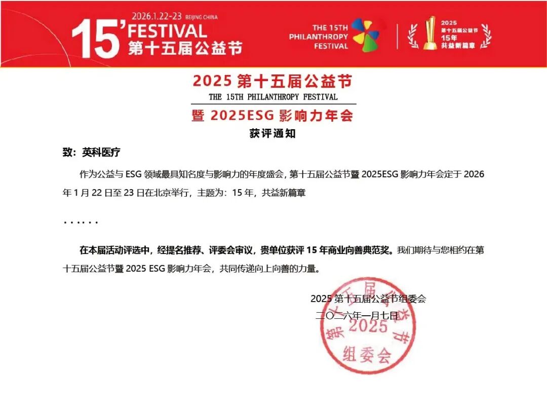 近日,在第十五届公益节暨2025 ESG影响力年会上,英科医疗凭借长期深耕公益事业与持续推进ESG实践的卓越表现,荣膺“15年商业向善典范奖”。这一荣誉不仅是对公司多年来积极履行社会责任的高度认可,也彰显了英科医疗在推动“商业向善”道路上的坚定步伐。