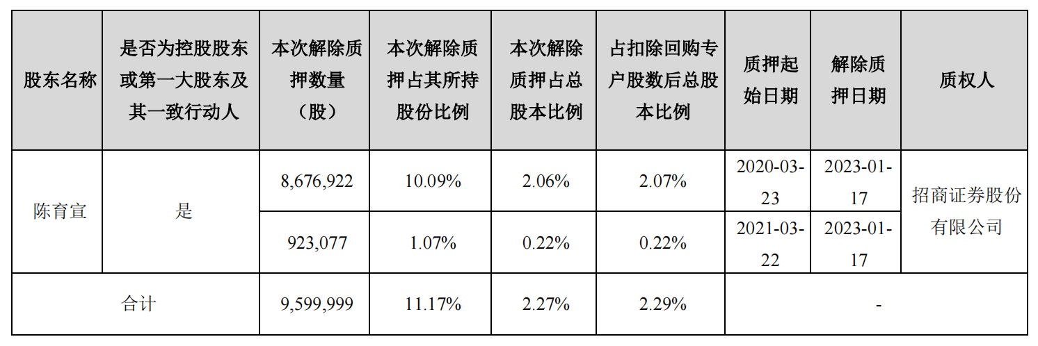 2023年1月18日,电连技术(300679.SZ)公告,公司于近日收到公司控股股东、实际控制人陈育宣先生的通知,陈育宣先生将其持有的公司部分股份提前办理了解除质押手续,具体情况如下: