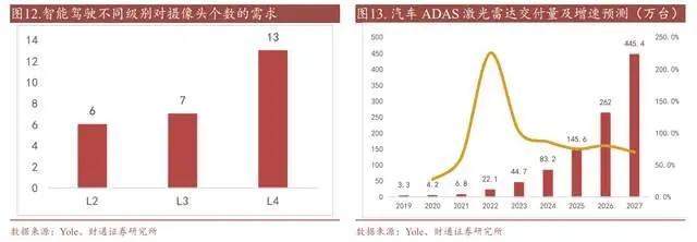 根据 Yole 数据统计,L2 级别自动驾驶需要 6 个摄像头,到 L4 级别自动驾驶摄像头需求将翻倍至 13 个。