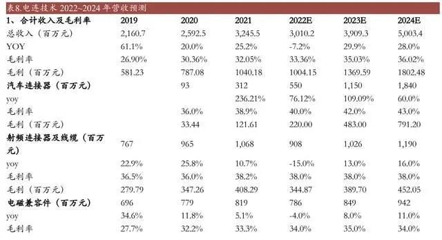 未来随着单车传感器数量增加,连接器使用需求也增加,进而提高单车价值量。我们预测汽车连接器业务2022~2024年收入为5.5/11.5/18.4亿元,增速为76%/109%/60%。