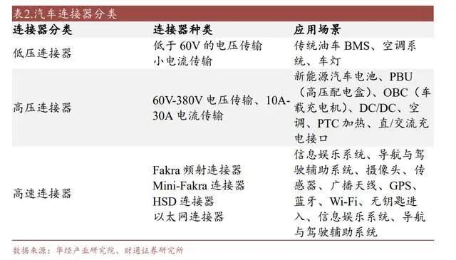 汽车连接器分为低压连接器、高压连接器、高速连接器。