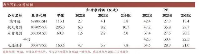 可比公司 2022-2024 年 PE 平均值为 42.3/30.4/22.5 倍;电连技术 2023 年 1 月 19 最新收盘价为 38.75 元,对应 2022-2024 年 PE 值为 34.6/28.9/21.0 倍;目前公司估值低于可比公司,存在一定向上修复空间。