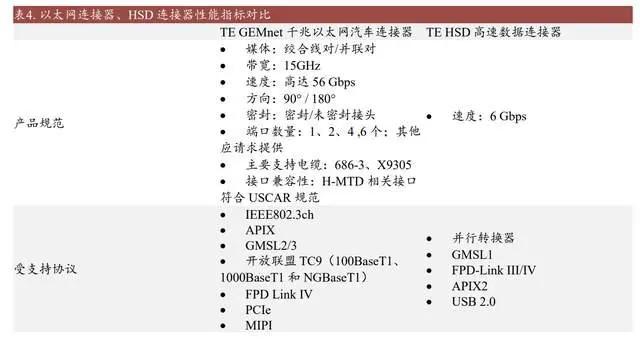 车载摄像头及激光雷达等传感器产生的数据流通过 Mini-Fakra 连接器输送到 AVM(环视系统)后,将由 HSD 连接器传输到主机端,主机端到座舱端到数据也由 HSD 连接器进行下一步传输。但由于 HSD 连接器的传输频率相对较低,线束成本高,长远来看,HSD 连接器将被以太网连接器取代。