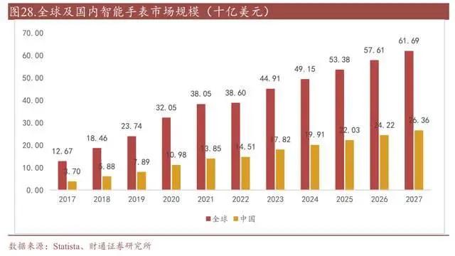 根据 Statista 预测,2027 年全球/国内智能手表市场将达到 616.9/263.6 亿美元,2021 年至 2027 年 CAGR 为 8.39%/11.32%。