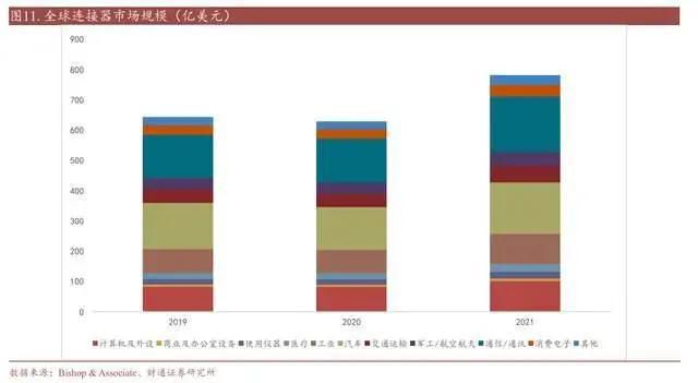 根据 Bishop & Associate 数据,2021 年全球连接器市场规模 779.91 亿美元,其中通信连接器占比 23.47%,排名第一,汽车连接器占比 21.86%,排名第二,计算机及外设连接器占比 13.13%,排名第三。
