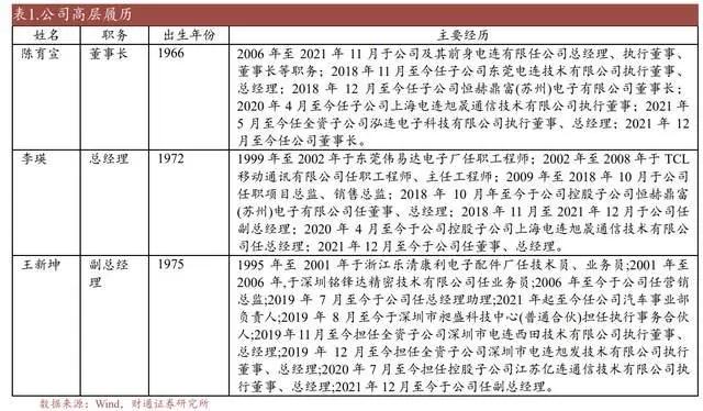 公司董长陈育宣在电子元器件行业具有丰富的研发、生产和销售经验,是深圳市连接器行业协副长;公司总经理李瑛自 1999-2008 年分别于东莞伟易达电子厂和 TCL 移动通讯有公司任职工程师;副总经理王新坤在电子行业具有超过十年的从业经验,对连接器营销具有独到认识,负责电连技术若干重要区域及客户的销售及维护工作。
