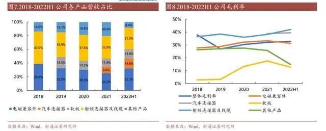 2022年上半年,公司各产品中,电磁兼容件营收 4.57 亿元,营收占比 32.3%;射频连接器及线缆营收 4.57亿元,占比 31.0%;汽车连接器营收 2.15 亿元,占比由 2021 年的 9.6%上升到 14.6%,其营收占比提升的原因是汽车行业目前在逐季恢复,成长性相对较好。