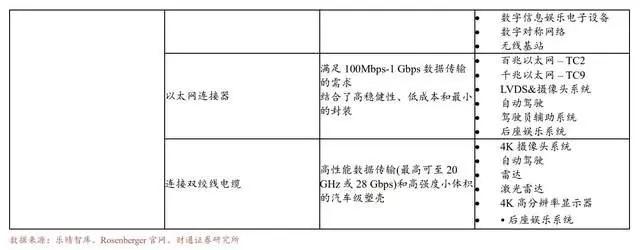 智能化汽车多种类数据传输及连接需求推动高频高速连接器用量提升。高频高速连接器主要应用于车载网络、车载信息娱乐系统及自动驾驶等汽车智能化应用场景。