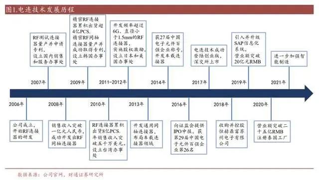 2006-2008 年开始研发并成功开发射频同轴连接器,2009 年精密射频同轴连接器量产并取得专利,2010 年射频连接器累积出货 8 亿 PCS。