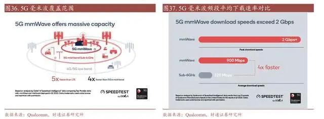 Speedtest by Oolak 的实际测结果表明,在 5G 毫米波频段现有网络的平均下载速率是 Sub-6 GHz 频段(6 GHz 及以下频段)的 4 倍,约是 LTE 的 20 倍。