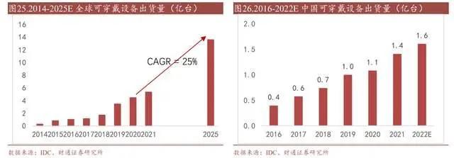 据 DC 数据,2021 年全球可穿戴设备出货量达到 5.34 亿台,预计 2025 年全球可穿戴设备出货量将达到 13.58 亿台,2020 年至 2025 年 CAGR+25%。