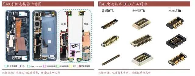 BTB 连接器在手机终端主要应用在手机显示器、主副板、指纹识别、喇叭、耳机等,iphone XS 中 BTB 连接器用量达到 15 对,安卓机中达到 10 对左右。