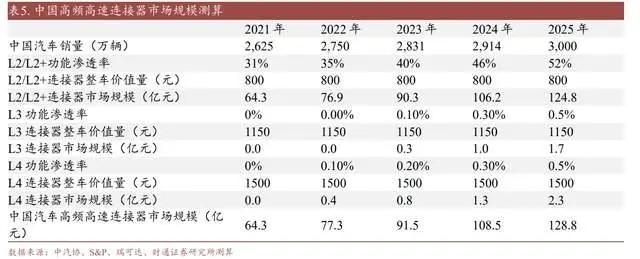 汽车智能化场景是驱动车载高频高速连接器市场规模增长的核心因素,我们预计 2025 年中国高频高速连接器市场规模有望达到 129 亿元,CAGR 为 19%,测算依据如下: