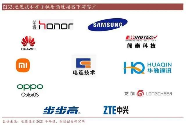 公司射频连接器产品在手机终端市场份较为稳定,是公司的优势产品,在手机行业内有一定的知名度,主要客户包括小米、华为、荣耀、欧珀、步步高、三星、中兴等全球知名智能手机企业的核心供应商,以及闻通讯、华勤通讯、龙旗科技等国内知名智能手机设计公司的供应链。