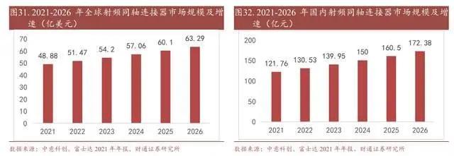 2021 年中国射频同轴连接器市场规模约为 121.76 亿元,预计 2026 年中国射频连接器市场规模将达到 172.38 亿元人,2021 年到 2026 年 CAGR 为 7.2%,高于全球的增长。