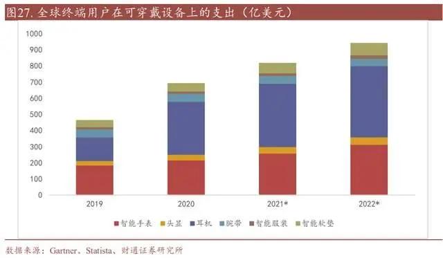 根据 Gartner 数据,2019 年全球终端用户在可穿戴设备上花费 461 亿美元,预计到 2022 年将增加到 938.6亿美元,四年内年复合增长率为 19.4%。其中,耳机及智能手表占比较大,耳机产品的年复合增长率最高,为 31.9%。