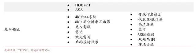 电连技术在模拟信号、数字信号及光信号三种传输方式上均有布局和配套产品。其中模拟信号多用于天线接入的收音机信号、GPS 信号和移动网络信号;数字信号应用则比较广泛,如车内的音频视频信号、消费电子外接 USB 和 HDM 等接口,以及近年不断增多的摄像头信号;光信号与电信号相比有极低的传输损耗,因此多用于高端的车载音频和视频传输。