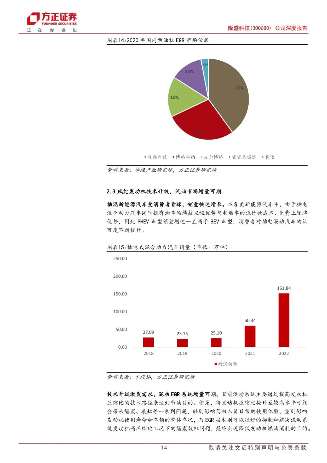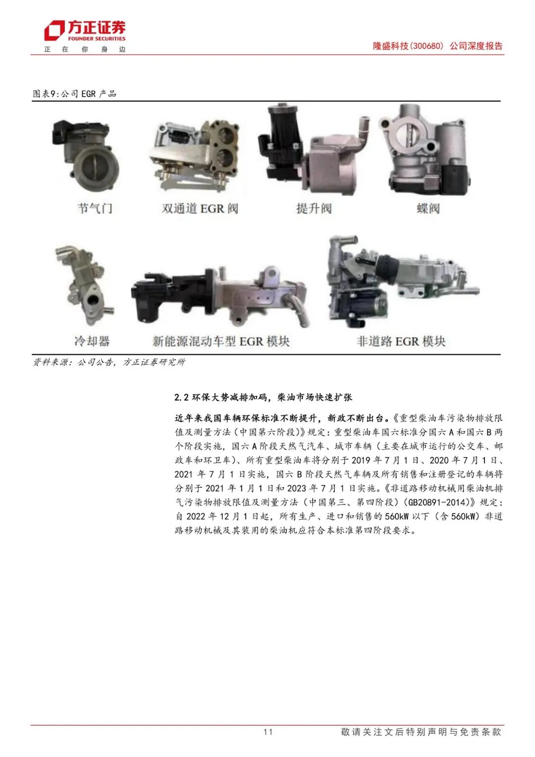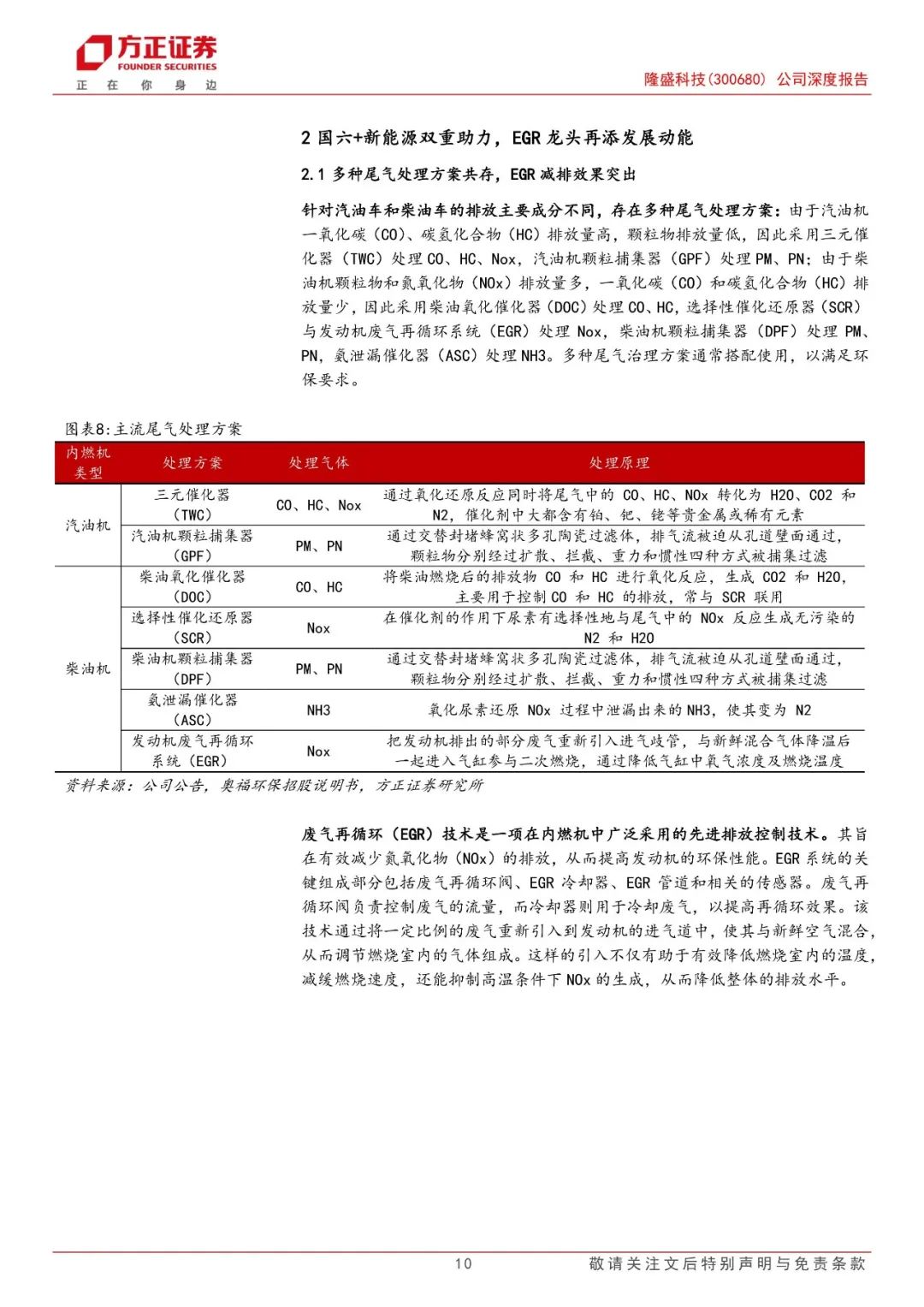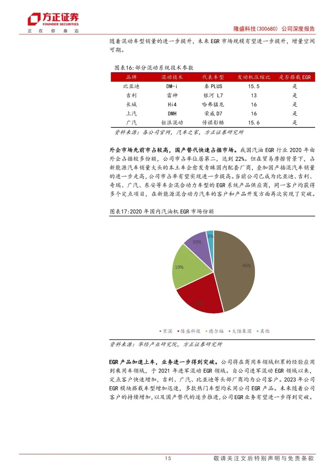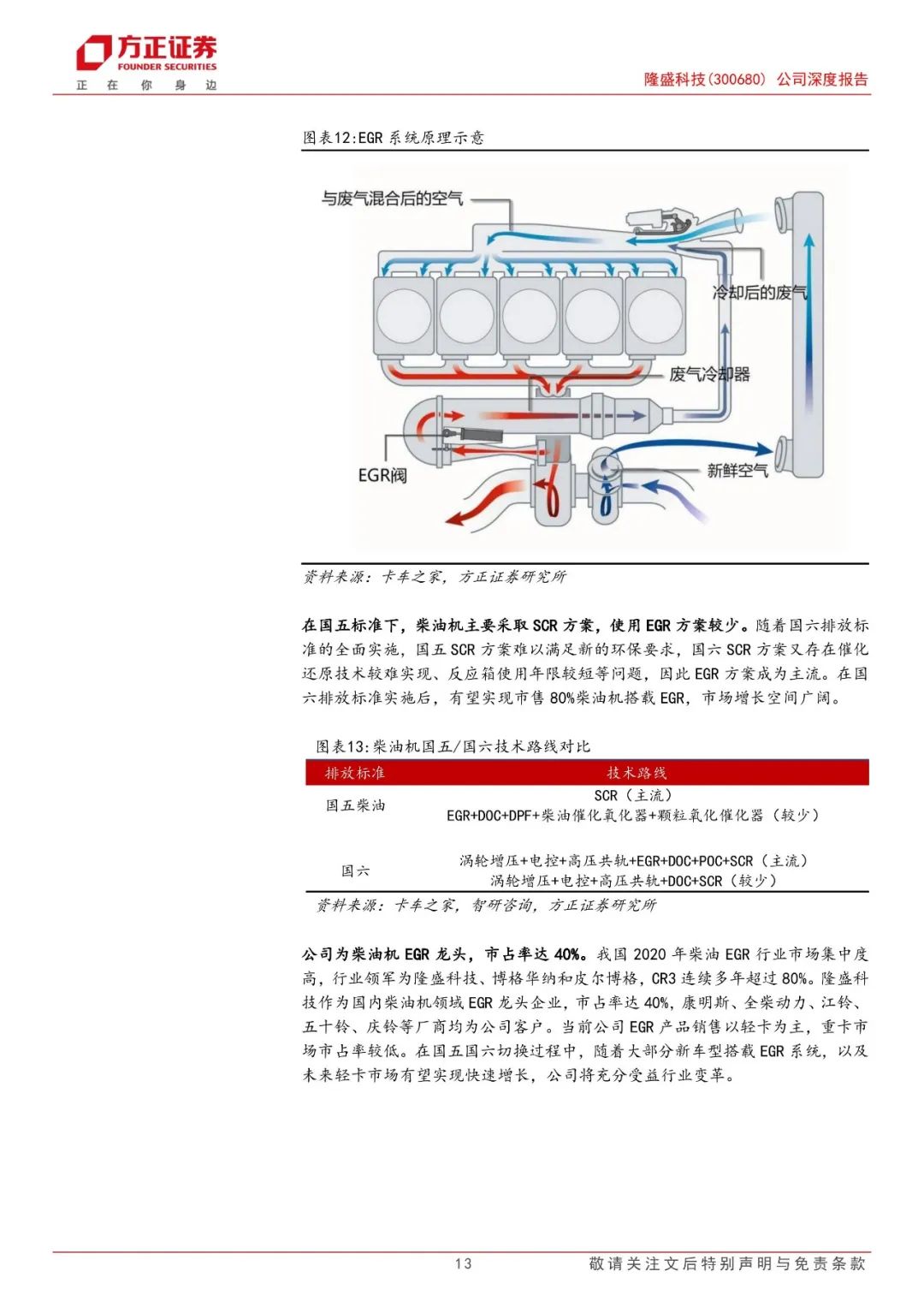国六+新能源双重助力,EGR龙头再添发展动能:柴油机方面,国六政策的推出使得EGR成为柴油机尾气处理主流方案,EGR渗透率快速提升;汽油机方面,EGR在传统混动/插电混动新能源车降低运行油耗、提高乘坐品质方面起到重要作用,新能源车市占率的提高带动EGR业务实现增长。公司为柴油机EGR市场龙头,汽油机EGR客户快速拓展,有望在国六+新能源双重助力下实现业务进一步突破。