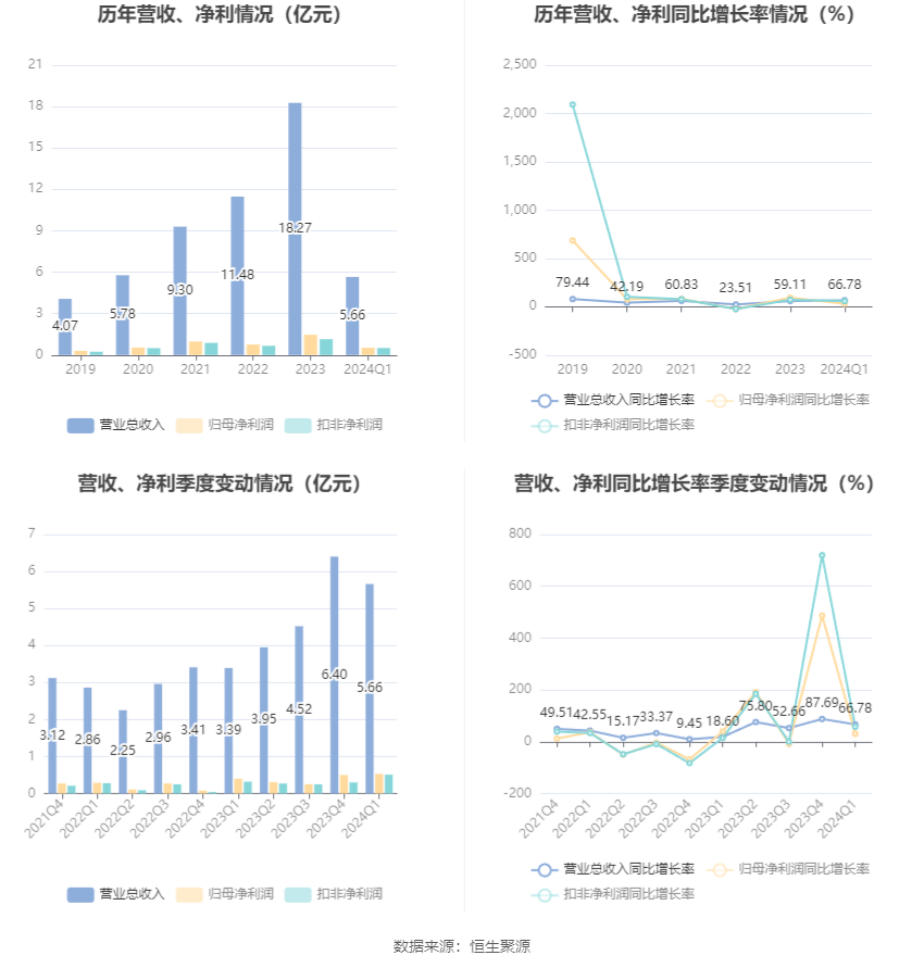隆盛科技(300680)4月22日披露2024年一季报。2024年第一季度,公司实现营业总收入5.66亿元,同比增长66.78%;归母净利润5266.16万元,同比增长30.18%;扣非净利润5115.25万元,同比增长57.80%;经营活动产生的现金流量净额为7573.57万元,同比增长93.09%;报告期内,隆盛科技基本每股收益为0.2279元,加权平均净资产收益率为2.99%。