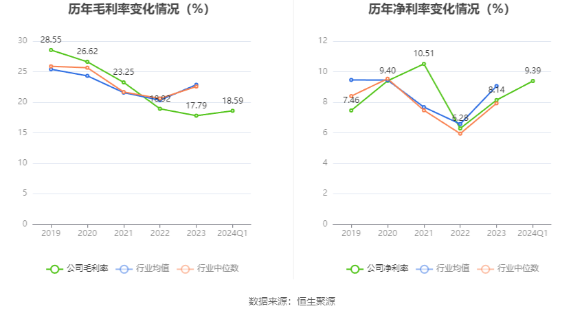 2024年第一季度,公司毛利率为18.59%,同比下降2.26个百分点;净利率为9.39%,较上年同期下降2.73个百分点。