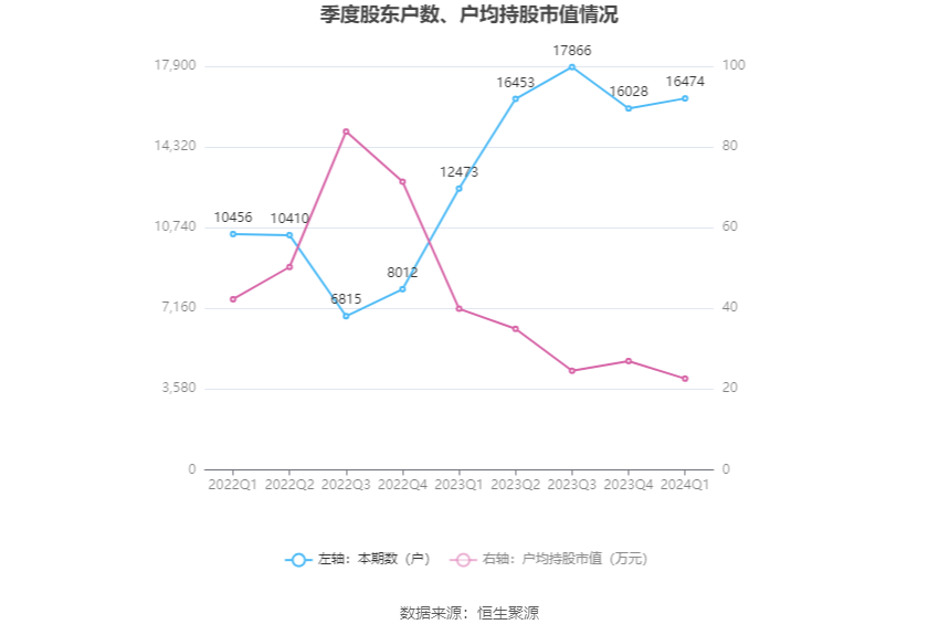 筹码集中度方面,截至2024年一季度末,公司股东总户数为1.65万户,较上年末增长了446户,增幅2.78%;户均持股市值由上年末的26.95万元下降至22.59万元,降幅为16.18%。