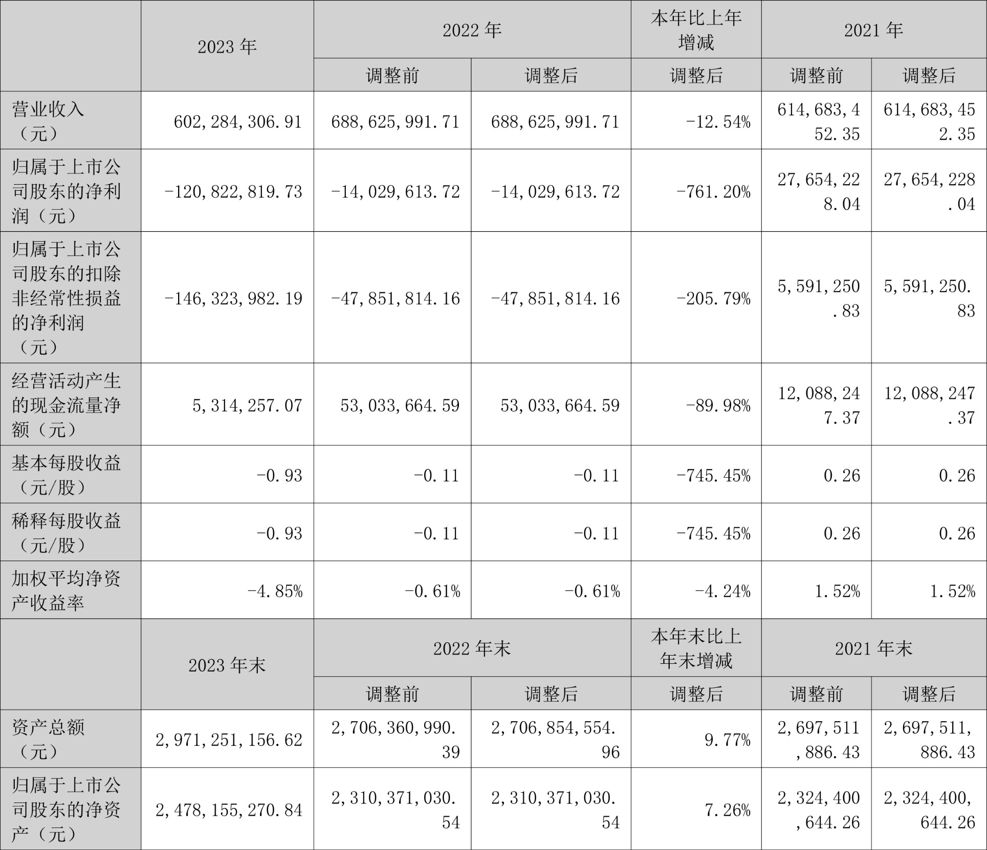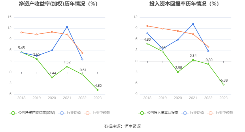 数据显示,2023年公司加权平均净资产收益率为-4.85%,较上年同期下降4.24个百分点;公司2023年投入资本回报率为-6.38%,较上年同期下降5.58个百分点。