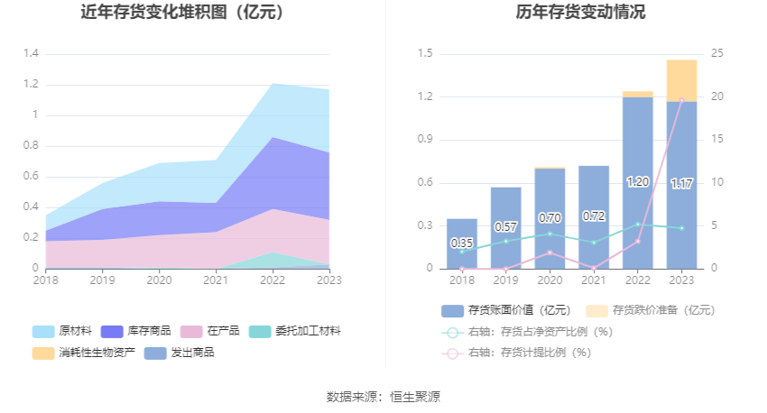 从存货变动来看,截至2023年年末,公司存货账面价值为1.17亿元,占净资产的4.74%,较上年末减少276.67万元。其中,存货跌价准备为2866.38万元,计提比例为19.62%。