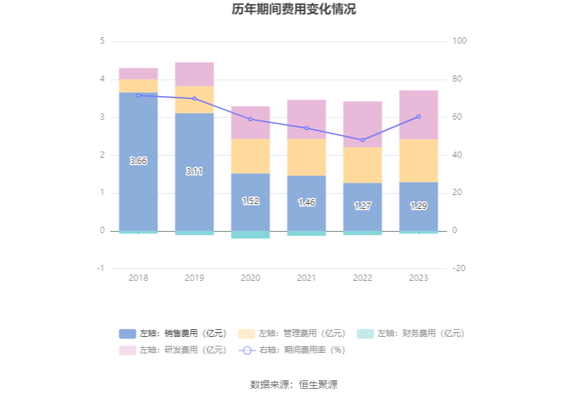 2023年,公司期间费用为3.64亿元,较上年同期增加3304.83万元;期间费用率为60.40%,较上年同期上升12.38个百分点。其中,销售费用同比增长1.55%,管理费用同比增长20.8%,研发费用同比增长6.15%,财务费用由去年同期的-1124.70万元变为-714.11万元。