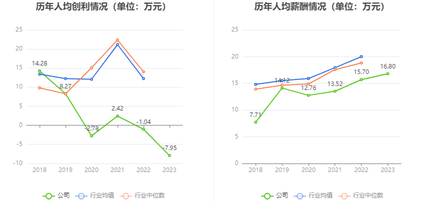 截至2023年末,公司员工总数为1520人,人均创收39.62万元,人均创利-7.95万元,人均薪酬16.80万元,较上年同期分别变化-22.55%、-662.61%、6.97%。