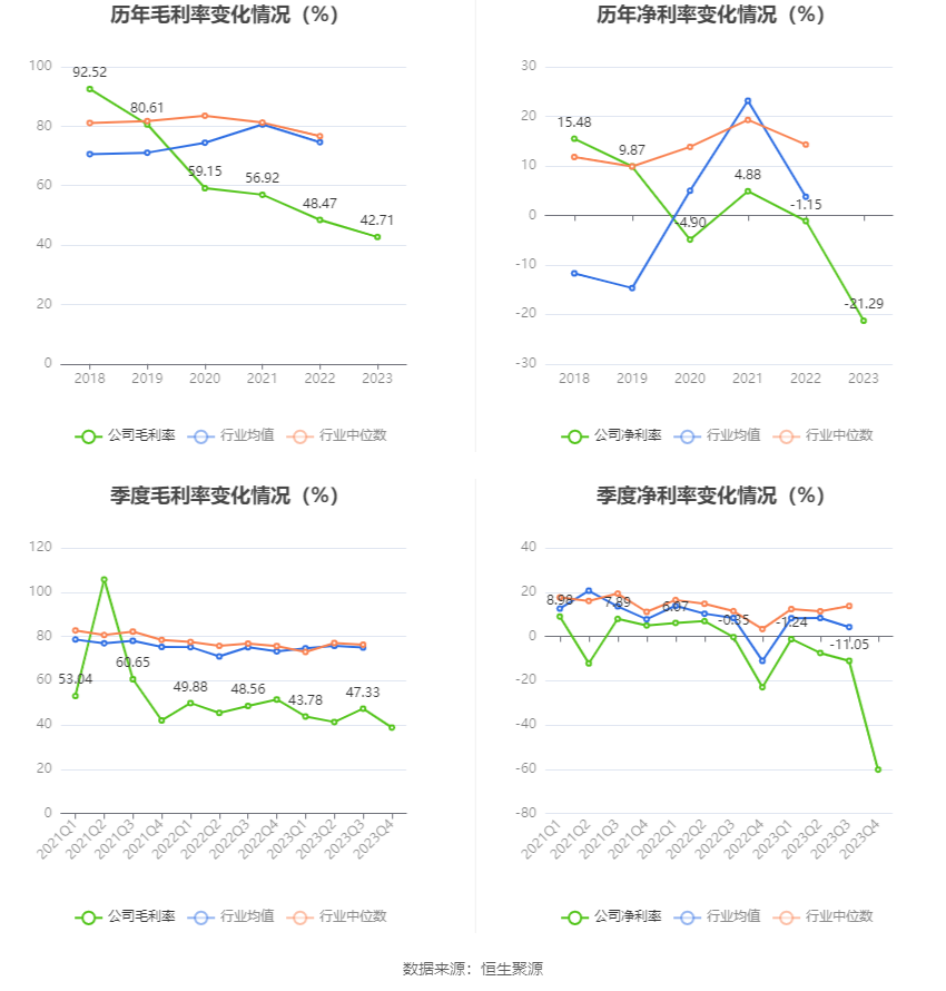 2023年,公司毛利率为42.71%,同比下降5.76个百分点;净利率为-21.29%,较上年同期下降20.14个百分点。从单季度指标来看,2023年第四季度公司毛利率为38.77%,同比下降12.69个百分点,环比下降8.56个百分点;净利率为-60.19%,较上年同期下降37.23个百分点,较上一季度下降49.14个百分点。