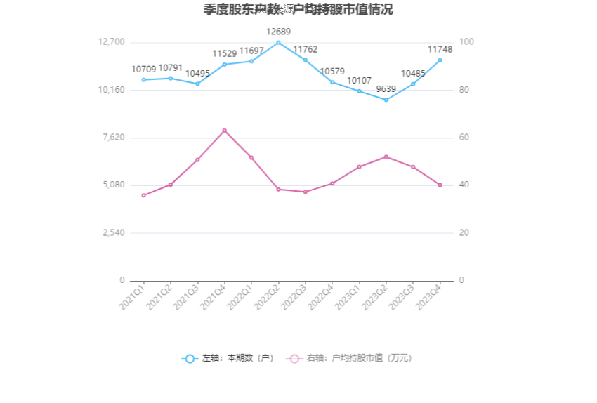 筹码集中度方面,截至2023年年末,公司股东总户数为1.17万户,较三季度末增长了1263户,增幅12.05%;户均持股市值由三季度末的47.81万元下降至40.23万元,降幅为15.85%。