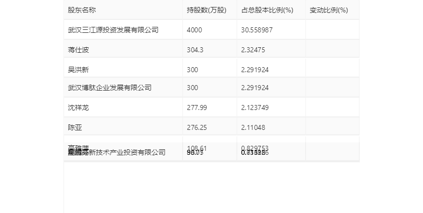 年报显示,2023年年末公司十大流通股东中,持股最多的为武汉三江源投资发展有限公司,占比30.56%。十大流通股东名单相比2023年三季报维持不变。在具体持股比例上,吴鹏持股有所下降。