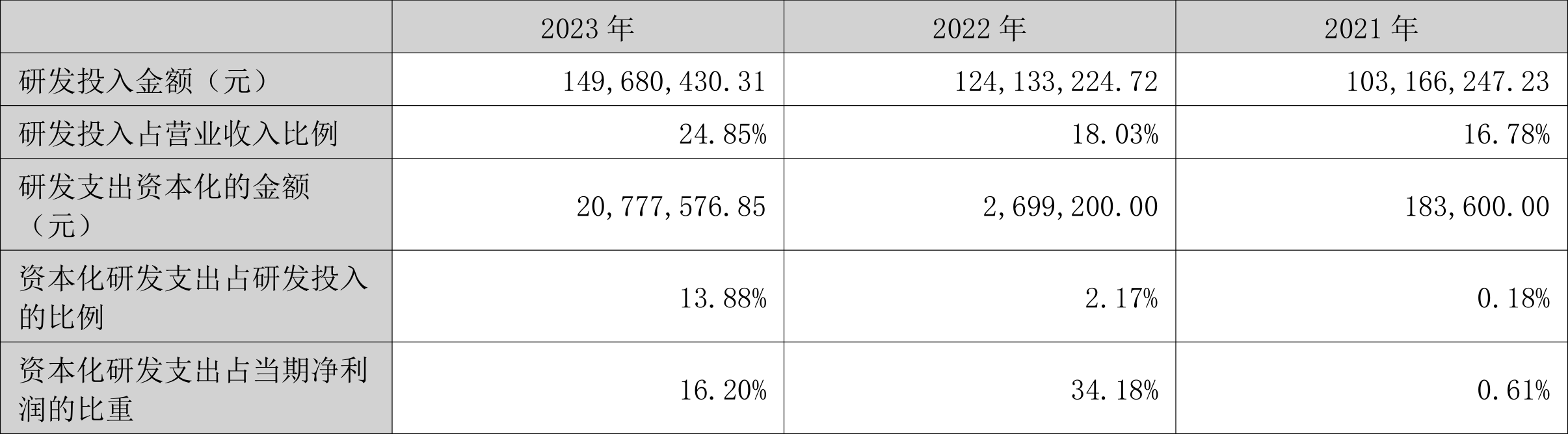 2023年全年,公司研发投入金额为1.50亿元,同比增长20.58%;研发投入占营业收入比例为24.85%,相比上年同期上升6.82个百分点。此外,公司全年研发投入资本化率为13.88%。
