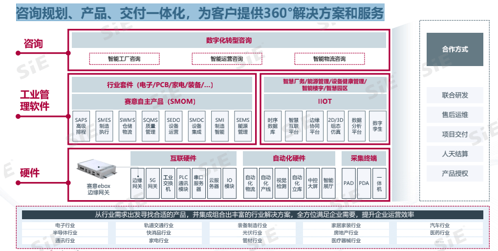 赛意信息自主研发的工业管理软件产品,从业务运营管理层到车间制造管理服务体系,以计划排程、物流管理、生产管理、品质管理、设备管理、运营管理六大核心业务模块为主体,形成以智能工厂为目标的智能制造整体解决方案。