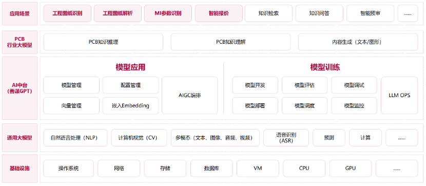 基于赛意信息自研AI中台-善谋GPT的PCB行业大模型深度融合计算机视觉(CV)、深度学习与自然语言处理(NLP)技术,综合平衡企业算力成本、训练成本、模型能力、应用价值等要素,通过接入通用大模型对PCB行业大量的工程图纸、订单资料、行业知识等数据进行分类、清洗、训练和精调,使其具备PCB专业知识理解、推理、解析和工程图纸识别等能力,帮助客户实现复杂工程图纸的自动阅读、解析、提取和处理,优化PCB设计和制造流程,推动PCB行业的数字化与智能化发展,加速行业智能化跃升。