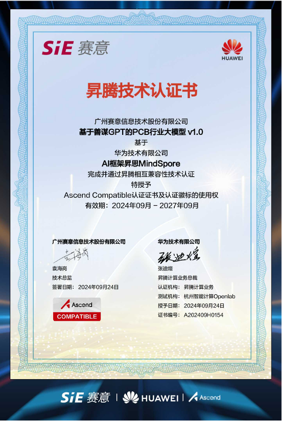 长期以来,赛意信息与华为在云、鲲鹏、鸿蒙、欧拉、盘古大模型等方面展开深度合作,在业务开展和生态共建取得了长足的成效。目前,赛意信息在提升自有AI能力的同时,正积极加入华为昇腾生态,通过整合双方在AI技术、行业解决方案及市场资源等方面的优势,已形成“PCB行业大模型”联合解决方案并与华为AI框架昇思MindSpore完成相互兼容性测试,同时取得华为昇腾技术认证书及Ascend Compatible徽标的使用权。