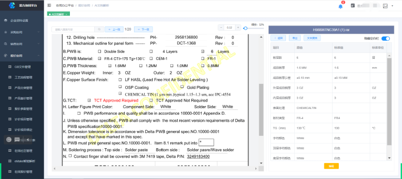 自动化MI参数提取:利用先进的图像识别和自然语言处理技术自动、准确地识别和解析工程图纸中层数、板厚、材质等关键参数,并将这些非结构化数据转化为可用于制造流程的结构化数据,大幅减少手动输入的需求,提高数据的准确性和处理效率,从而加快整个PCB制造的前期准备时间。