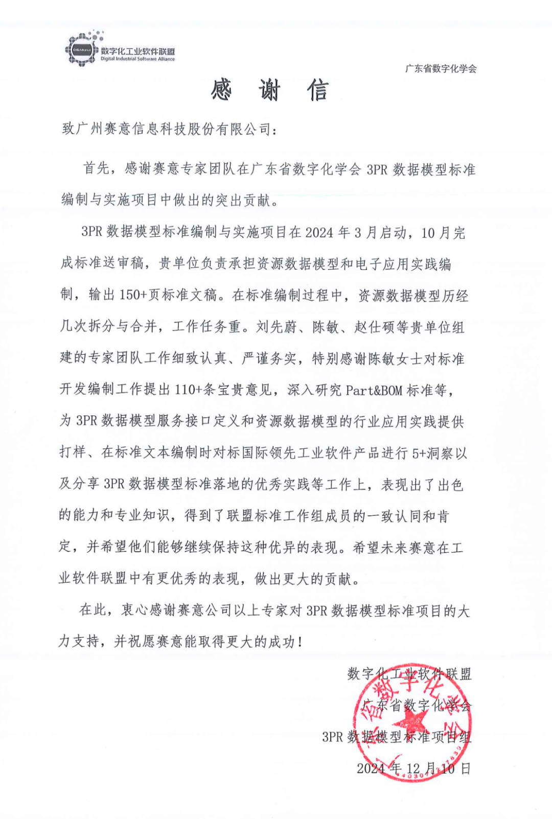近日,广东省数字化学会向赛意信息发来感谢信,对赛意信息专家团队在广东省数字化学会“3PR 数据模型标准编制与实施项目”中做出的重要贡献表示肯定及衷心感谢,希望未来加强紧密合作,携手打造新一代工业软件标准体系。