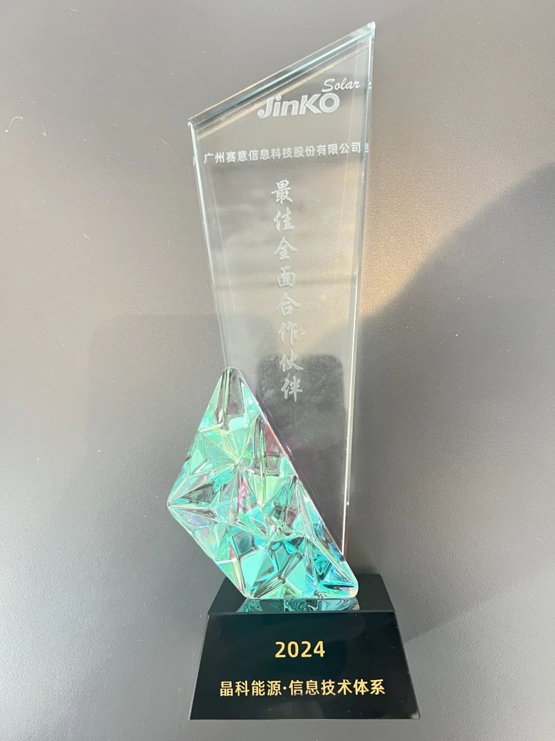 正是这些年来的携手并进,双方不仅实现了业务上的突破,更在风雨同舟的过程中实现了共同成长。这个奖项不仅是对赛意信息 2024 年工作的认可,更是对双方近十年深厚合作的高度赞誉。它象征着赛意信息与晶科能源在未来的日子里,将继续携手前行,共克时艰,创造更多辉煌。