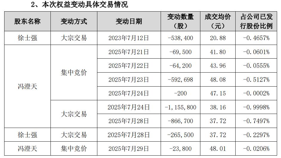 澄天伟业公告显示,2025年7月21日、7月22日、7月23日、7月24日、7月29日,冯澄天通过集中竞价减持股数分别为69,500股、64,200股、592,698股、200股、23,800股,成交均价分别为41.80元、43.96元、48.08元、47.15元、48.01元。2025年7月24日、7月28日,冯澄天通过大宗交易减持股数分别为1,155,800股、866,700股,成交均价分别为38.16元、37.72元。2025年7月28日,徐士强通过大宗交易减持股数265,500股,成交均价37.72元。