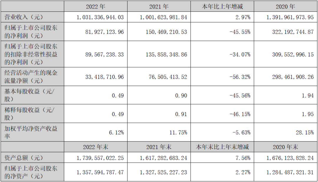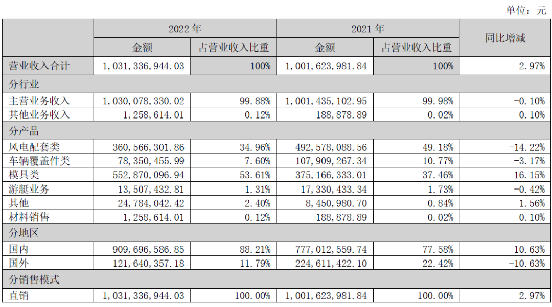 中国风电新闻网讯:4月7日,双一科技公布2022年度年报,2022年度公司实现营业收入10.31亿元,比去年同期增长2.97%,主营业务成本8.14亿元,比上年同期增长14.91%,归属于上市公司股东的净利润8,192.71万元,较去年同期下降45.55%,扣除非经常性损益后的净利润8,956.72万元,较去年同期下降34.07%。其中,风电配套类产品(风电机舱罩/轮毂罩和叶片根)收入3.61亿元,比去年同期下降26.8%。下降主要原因为受全球风电装机量下降影响和风电行业中标价格下降影响,公司风电机舱罩产品2022年销售量及销售收入较去年同期有所下降。