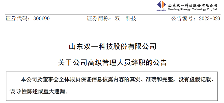 双一科技(300690)发布公告称,山东双一科技股份有限公司(以下称“公司”)董事会于近日收到投资总监、副总经理马骏先生提交的书面辞职报告。马骏先生因个人原因,辞去投资总监、副总经理职务后将不再在公司担任任何专职职务。该辞职报告自送达董事会之日起生效。马骏生先生所负责的工作已进行妥善交接,其辞职不会对公司日常生产经营活动产生不利影响。