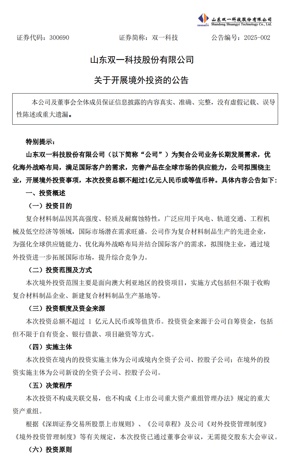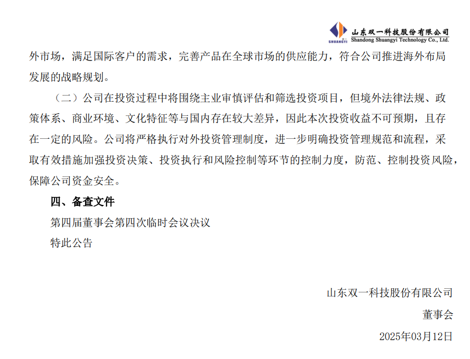 3月12日,双一科技发布公告,公司拟围绕主营业务开展境外投资,投资总额不超过1亿元人民币或等值币种。