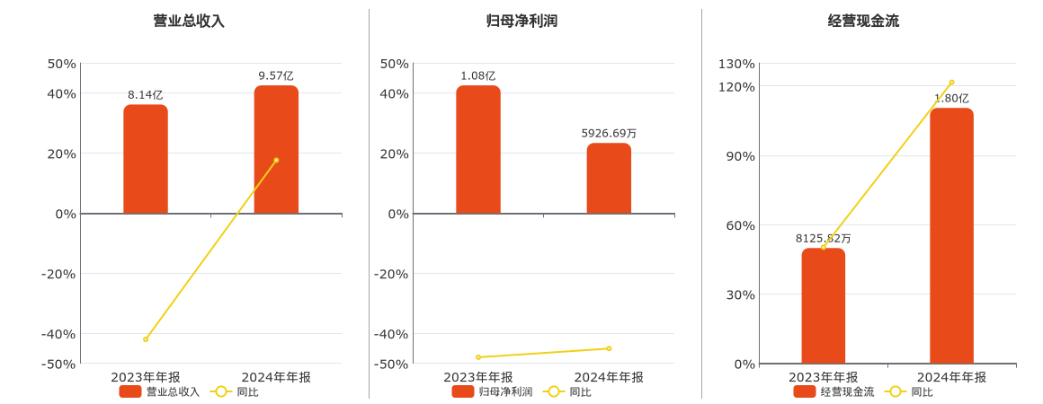 公司营业总收入为9.57亿元。归母净利润为5926.69万元,较去年同报告期归母净利润减少4869.54万元,同比较去年同期下降45.10%。经营活动现金净流入为1.80亿元。